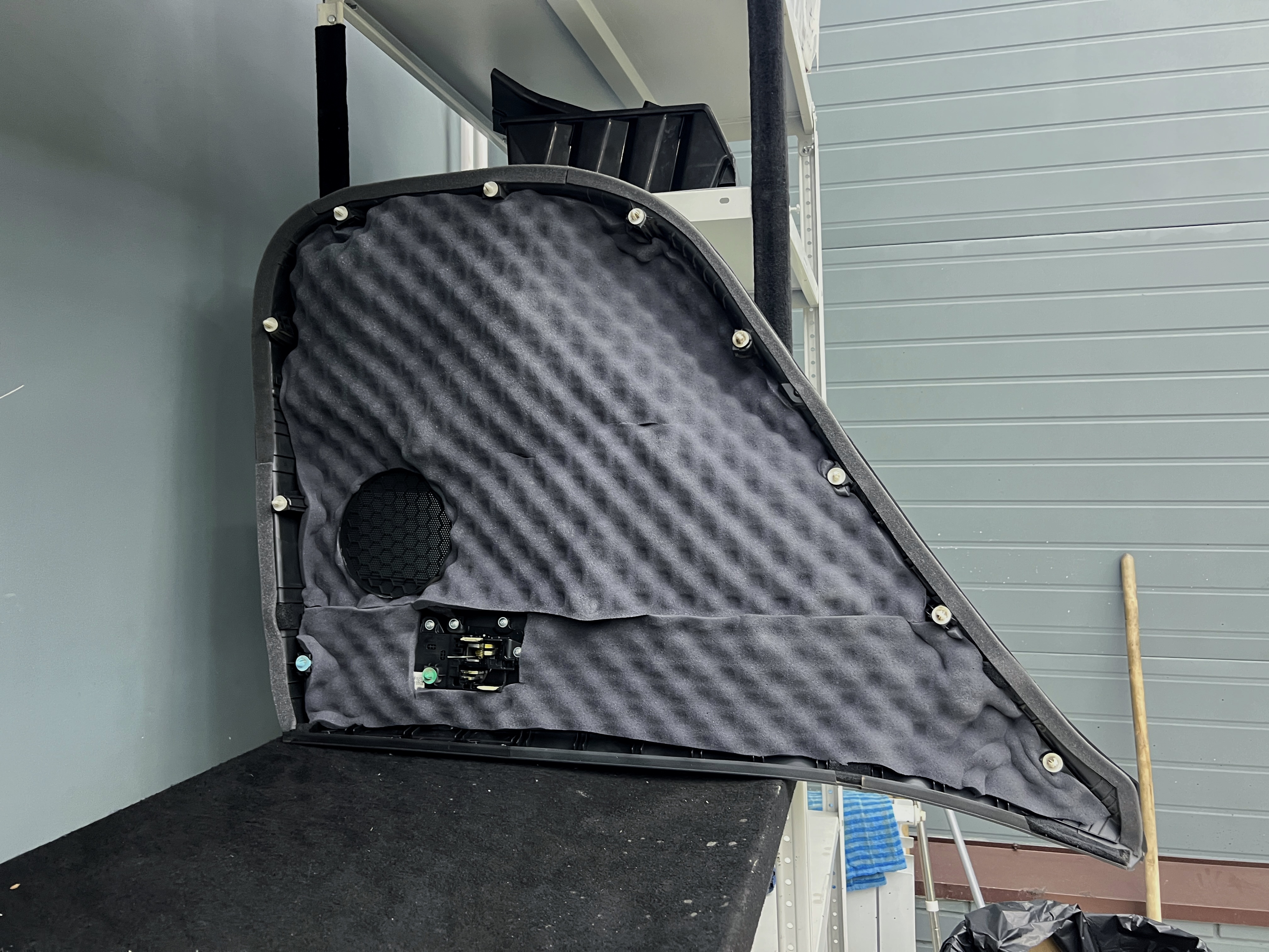 Приступаем к шумоизоляции дверей Hyundai Elantra (Хендай Элантра). Разбираем все дверные обшивки. Убираем их на специальный стеллаж, чтобы не повредить.