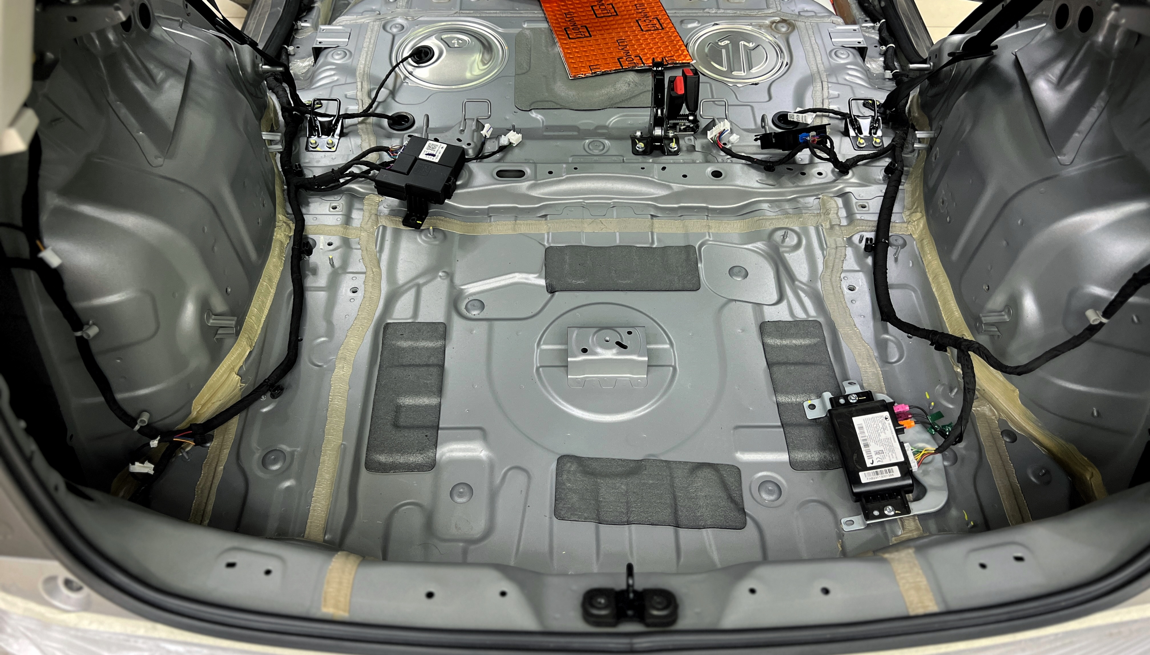 Дно багажника и крылья оклеиваются шумо и теплоизолятором Шумофф П4 4. Арки оклеиваются шумопоглотителем Flex A15.