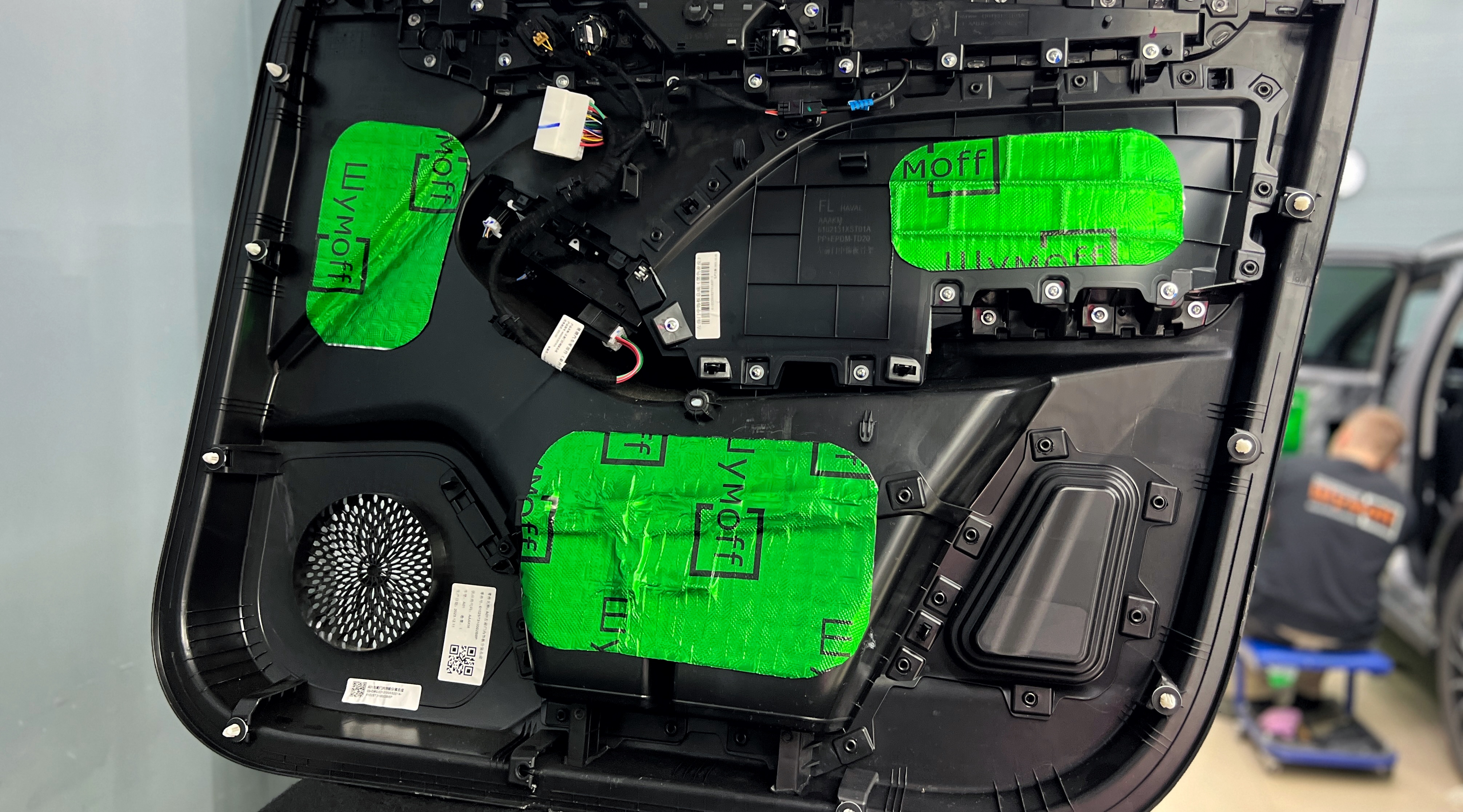 Для второго слоя на технологические отверстия используем так же Шумофф М2. Этот слой помимо еще одного барьера для внешнего шума позволит раскрыть потенциал акустической системы, установленной в дверях.