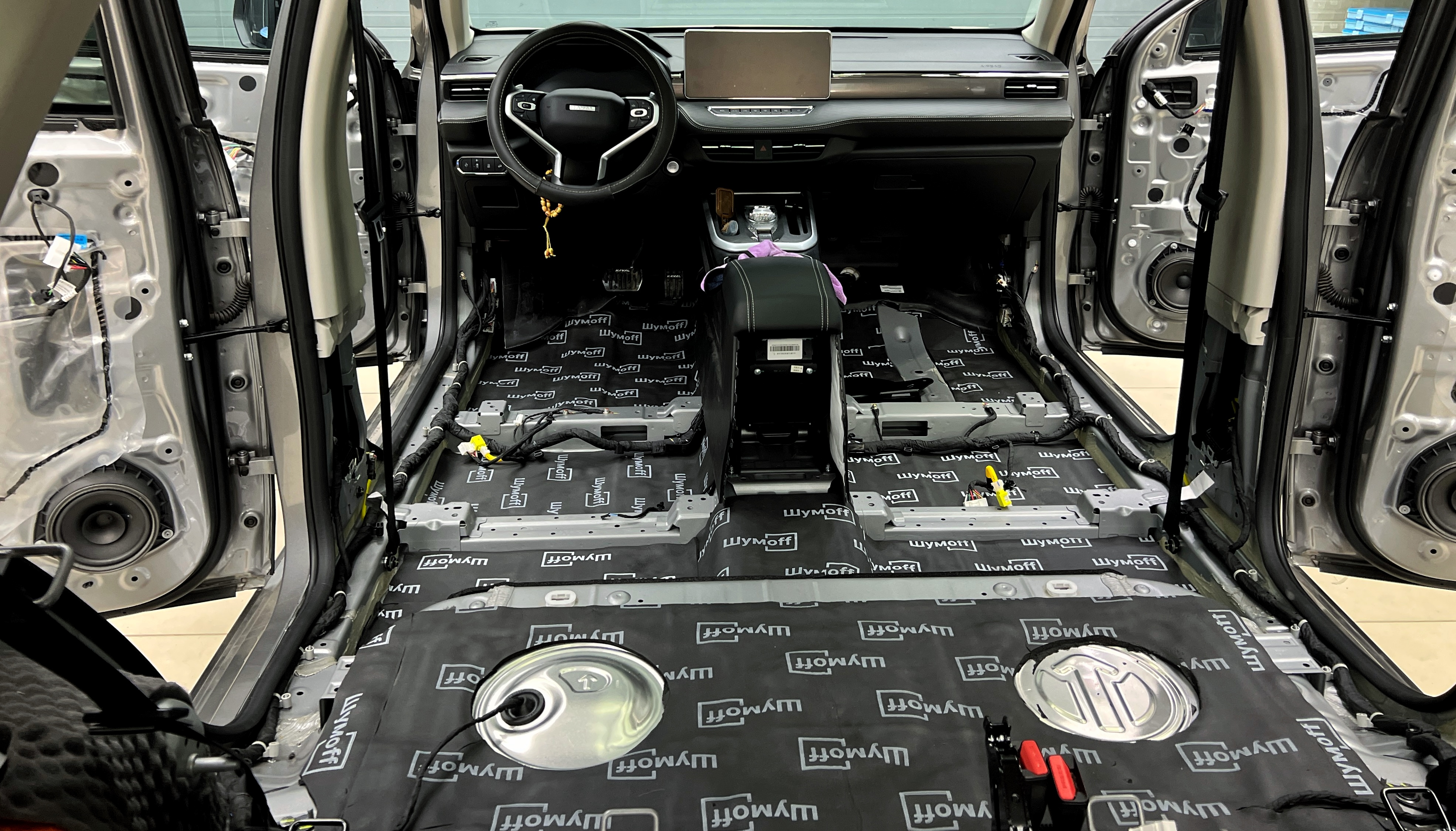 Пол от моторной перегородки и до заднего сиденья оклеивается толстой виброизоляцией Шумофф Super Jack. Под заднее сиденье клеится виброизоляция Шумофф Black Jack.